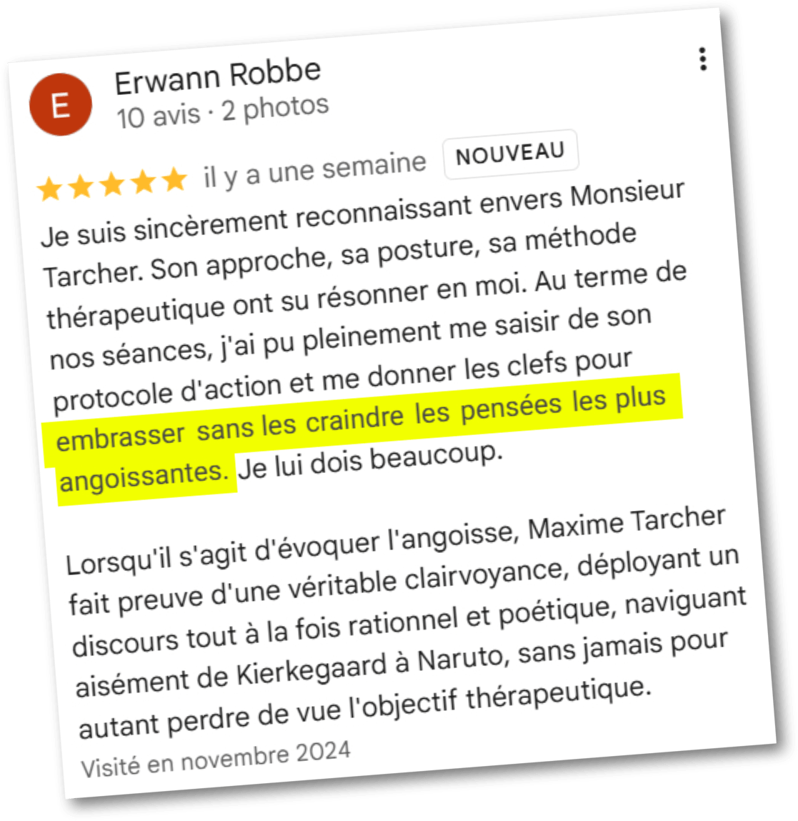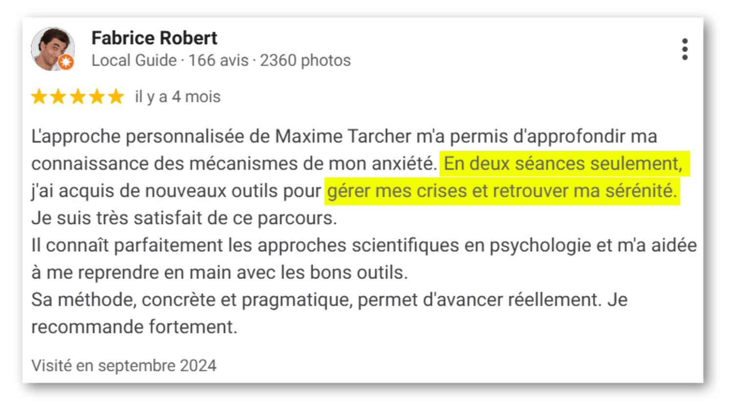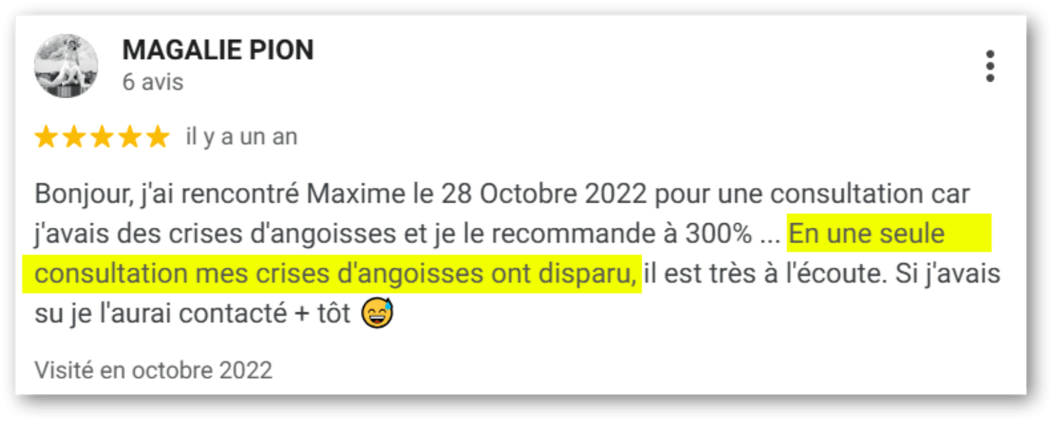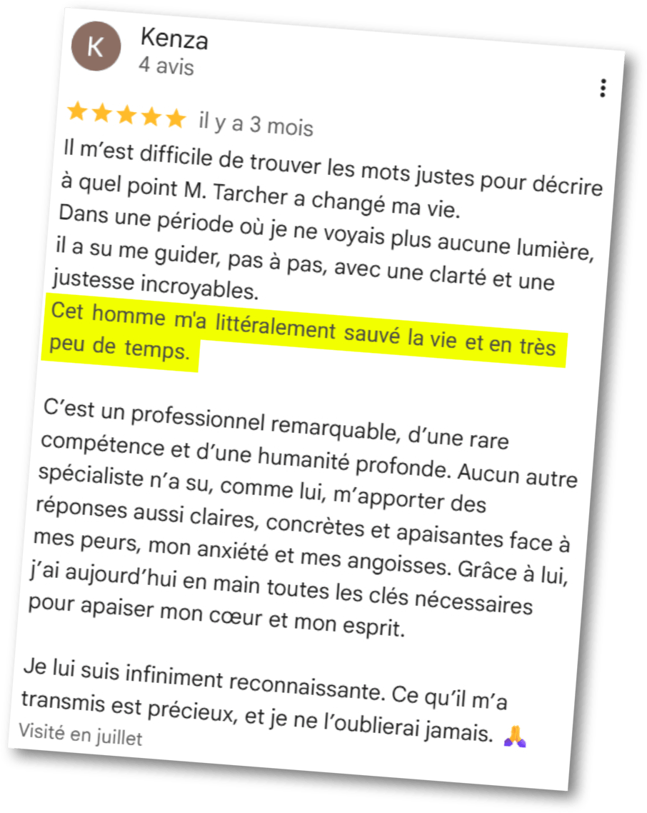 Je vous aide personnellement à remettre du sens sur votre angoisse. Vous comprenez enfin pourquoi ce que vous faisiez n'a pas fonctionné, et pourquoi ce qu'on fait fonctionne. Une véritable bouffée de bon sens et d’air frais !