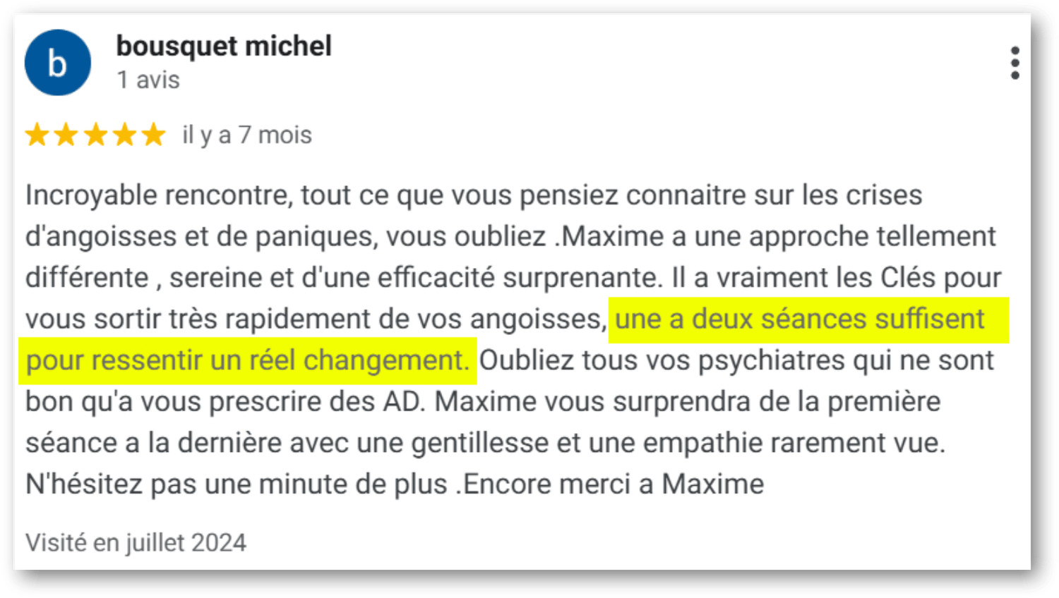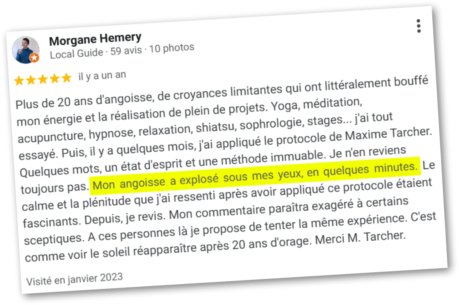 La vitesse est au cœur de mon approche, car dans l’angoisse, le temps joue contre nous. Plus on attend, plus elle s’installe et déborde sur des aspects de vie jusque-là préservés. En moins d’une heure, vous comprenez enfin pourquoi l’angoisse est là, ce qui suffit souvent à faire baisser son intensité immédiatement. Puis, dans les jours qui suivent, nous lançons les sessions. Sous 30 jours, le Protocole devient votre mode de fonctionnement par défaut. Bien entendu, le délai reste indicatif. Il dépend de votre rythme d’application et des problématiques associées. Un deuil, par exemple, demandera plus de temps. Je ne promets pas de magie, mais on vise une efficacité telle que vous aurez sûrement l’impression d’utiliser un bazooka pour éliminer un moustique. 💥🦟